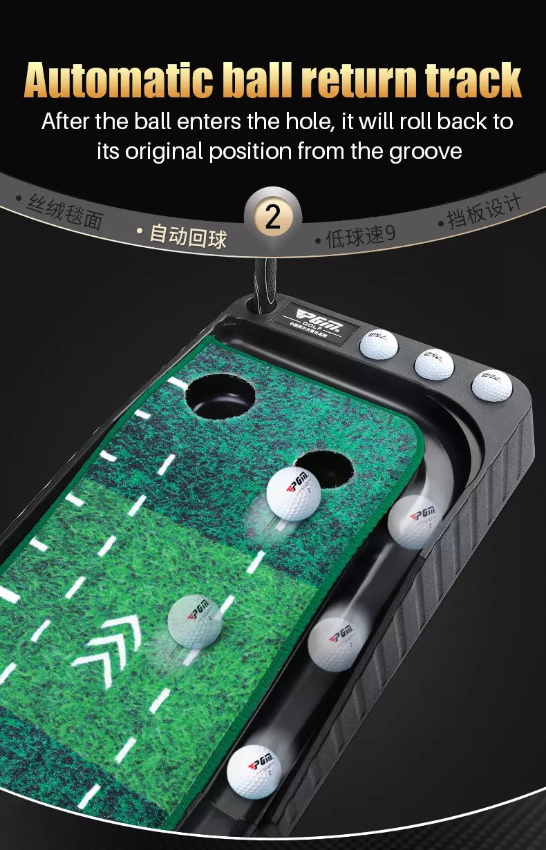 มีที่กั้นลูกกอล์ฟไม่ให้ออกนอกพรม มีระบบรางลูกไหลกลับ