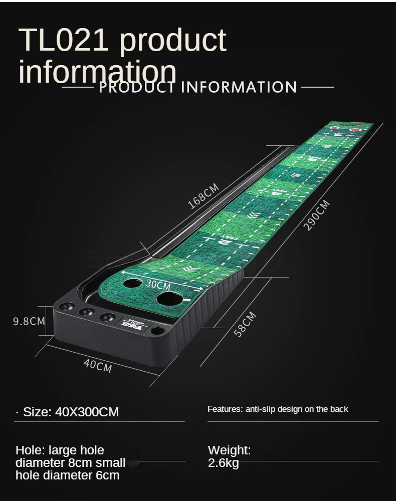 พรมซ้อมพัต TL021 พรมมีความกว้าง 30cm ความยาว 332cm มีระบบรางลูกไหลกลับ มีหลายระยะให้ซ้อม วัสดุเป็นพรมกำมะหยี่อย่างดี มีที่กั้นลูกกอล์ฟไม่ให้ออกนอกพรม มีระบบรางลูกไหลกลับ มีจุดมาร์คให้ฝึกซ้อมได้หลายรูปแบบ หลายระยะสวยมาก คุณภาพดีมากครับ นำไว้ฝึกซ้อมพ